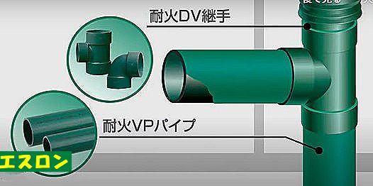 パイプ同士をつなぐ耐火DV継手にも独自の燃焼遅延配合を採用しています。「透明耐火DV継手」と着色接着剤の組み合わせで施工管理も容易に。