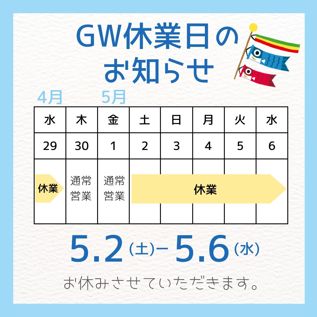 今回はGWの休業日をお知らせします!